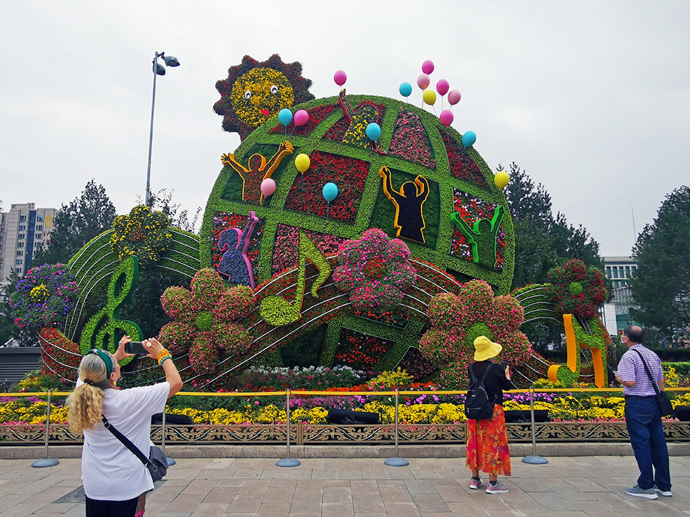 東單西南角佈置“命運共同體”主題花壇,花壇頂高8.5米,以地球為主景,配以放飛氣球的兒童、友誼的飄帶、花朵、音符等,體現出了我們將高舉和平、發展、合作、共贏旗幟,同世界各國人民深化友誼、加強交流,推動構建人類命運共同體。(攝影:楊先燦)