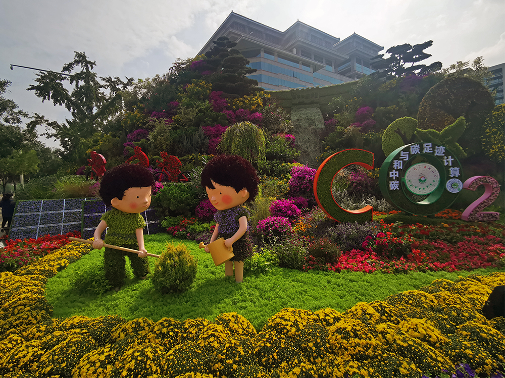 西單東南角主題花壇為“綠色發展”,花壇頂高9.5米,通過百花齊放春滿園的場景,配以白鶴灘水電站、太陽能板、騎行的人、植樹的兒童、碳中和計算互動裝置等,展示出通過提升林業碳匯,助力實現碳中和,同時展望綠色發展的美好明天。(攝影:楊先燦)