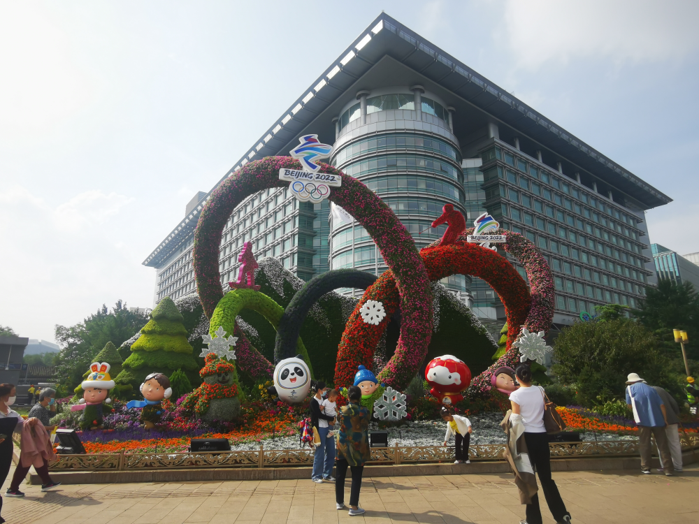 西單西南角花壇以“喜迎冬奧”為主題,花壇頂高8.5米,以喜迎冬奧的冰天雪地為主景,通過發展全民健身運動,努力建設健康中國,弘揚奧運精神,展示中國魅力。(攝影:楊先燦)
