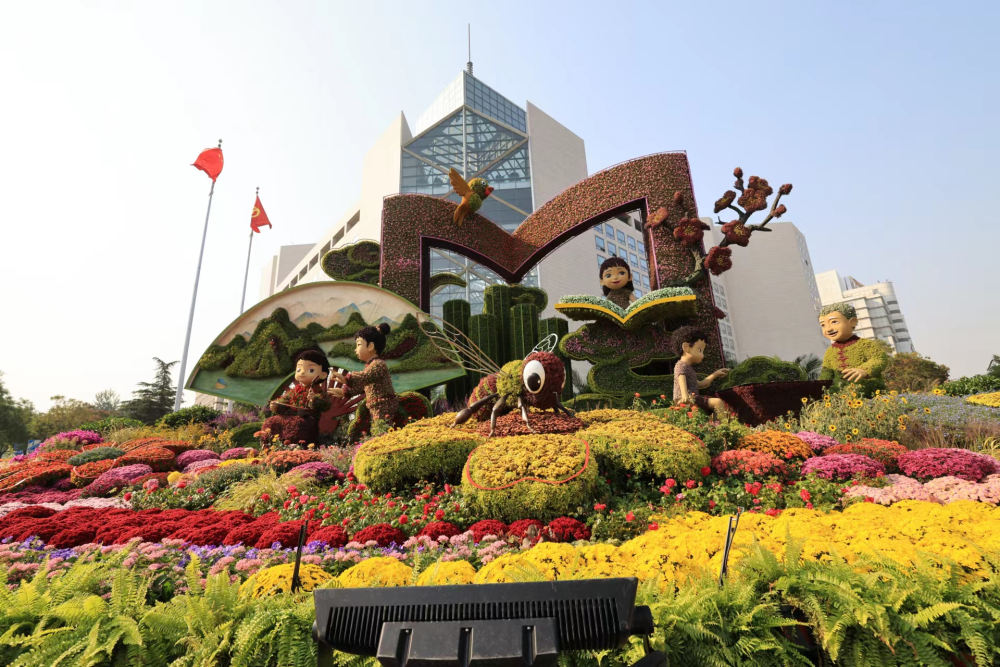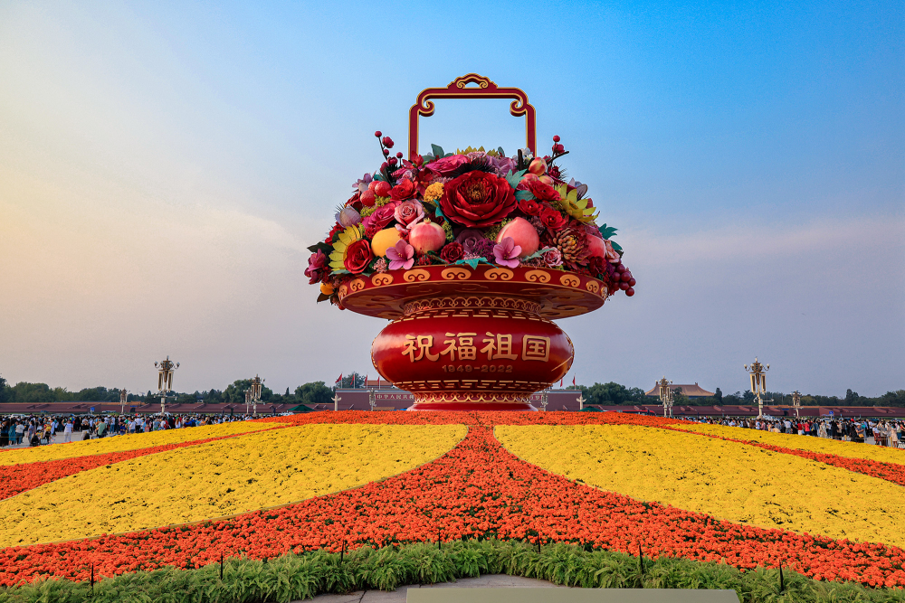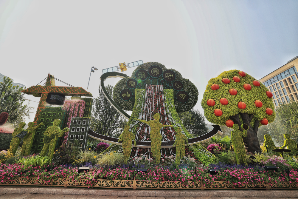 東單西南角佈置“共用發展”花壇,花壇頂高8.5米,以共建共用的社會現代化建設為場景(基礎建設、數據交互、北斗導航、智慧城市等),寓意人民群眾在共建中各盡其能,在共用中各得其所,一起共用經濟社會發展成果,有更多獲得感、幸福感、安全感。(攝影:王越)