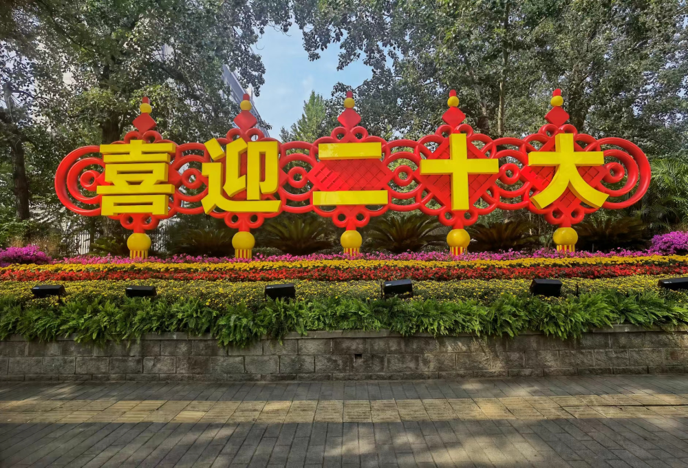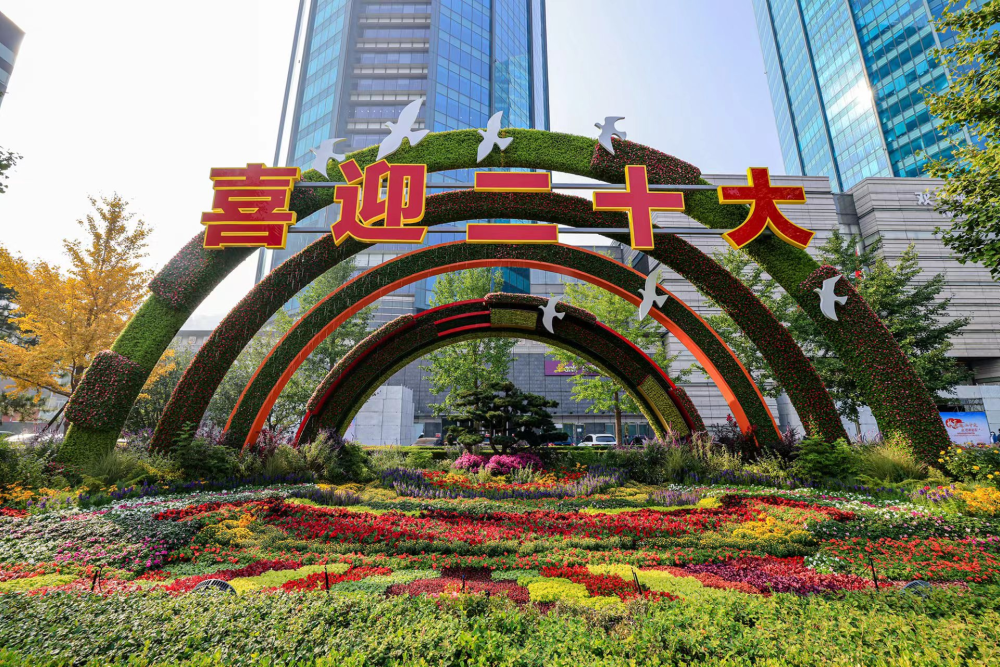 雙子座大廈佈置“喜迎(慶)盛會”花壇,花壇頂高7.5米,以彩虹門為主景,鑲嵌有“喜迎二十大”組字,烘托喜迎盛會的喜慶氛圍,以實際行動和優異的成績迎接二十大勝利召開。(攝影:王越)