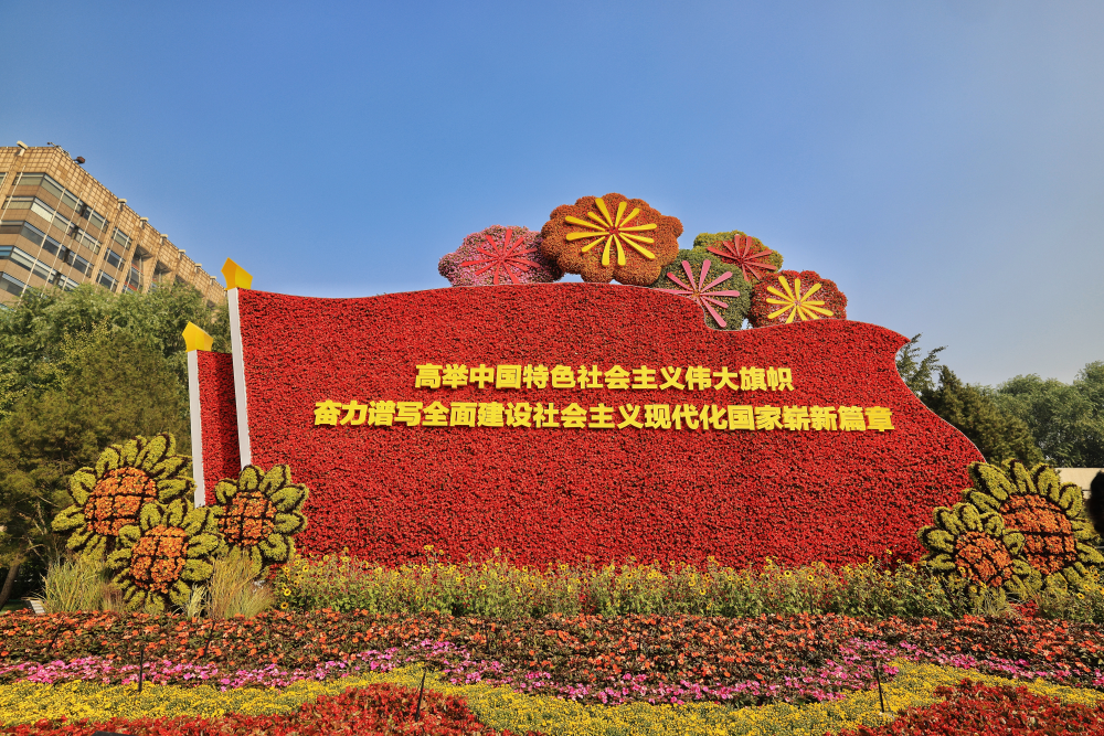 建國門西北角佈置“偉大征程”花壇,花壇頂高8米,以嵌有“高舉中國特色社會主義偉大旗幟 奮力譜寫全面建設社會主義現代化國家嶄新篇章”文字的紅旗為主景,配以向日葵、煙花等,寓意奮進新征程,吹響全面建設社會主義現代化國家的時代號角。(攝影:王越)