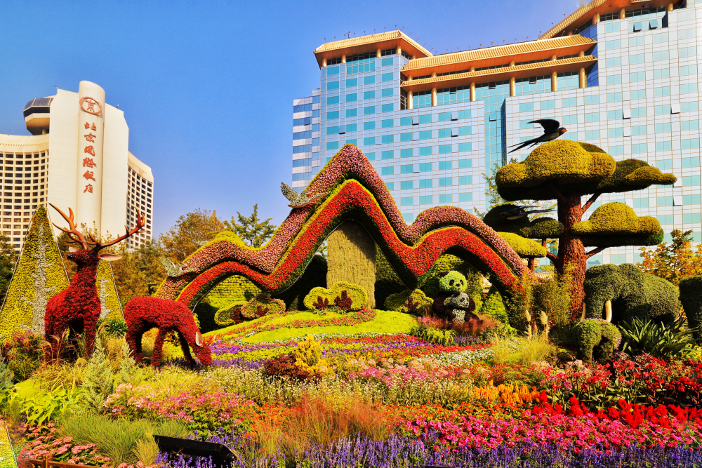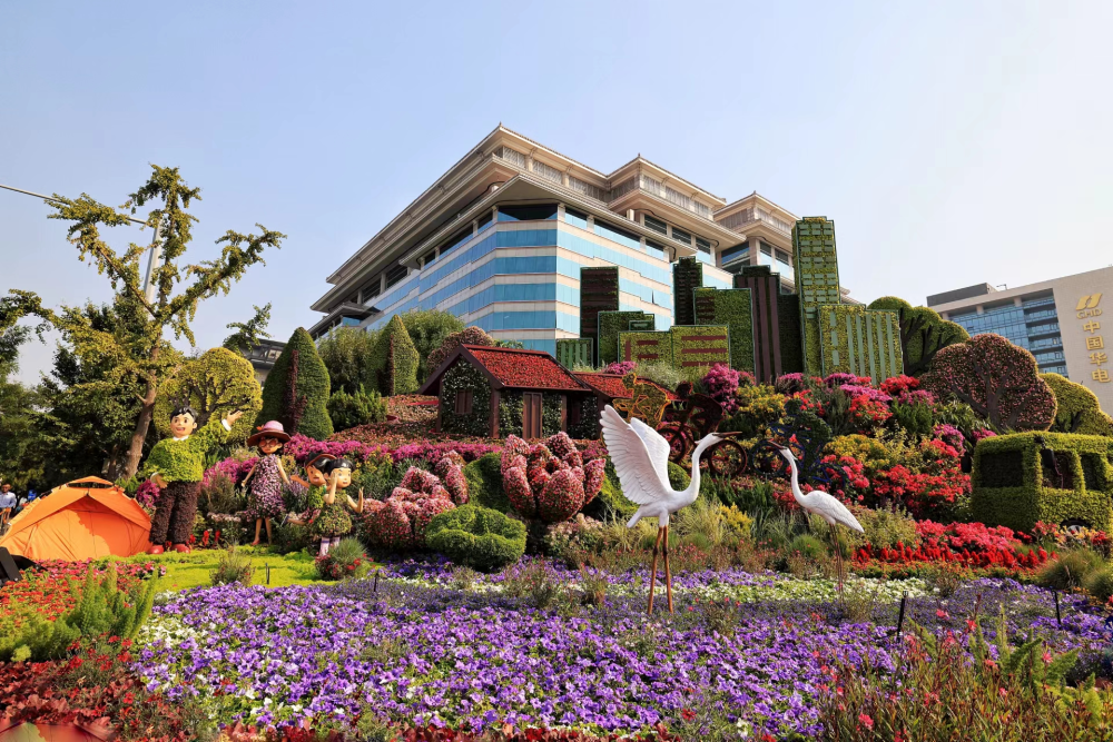 長安大廈佈置“綠色發展”花壇,花壇頂高8.5米,以祖國的錦繡河山為場景,體現了生態優先、綠色發展的美好景象,寓意綠水青山就是金山銀山。(攝影:王越)