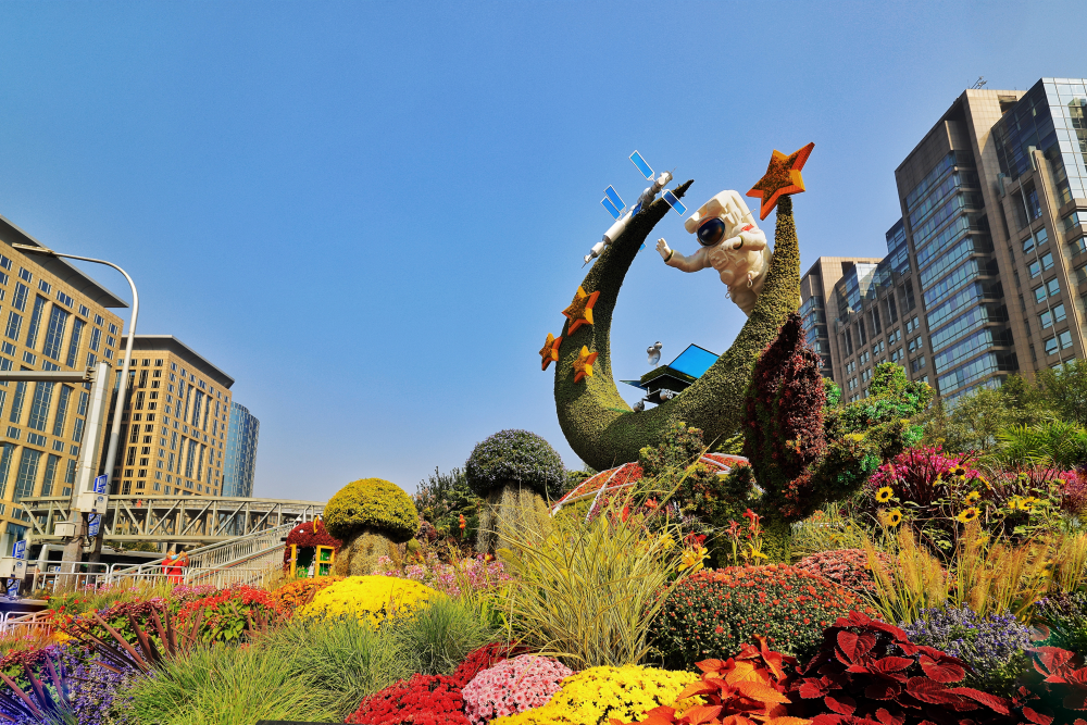 東單東北角佈置“創新發展”花壇,花壇頂高9.5米,以宇航員遨游太空和海鬥探索海洋為主景,配以中國空間站、玉兔號月球車等,寓意全面貫徹新發展理念,深入實施創新驅動發展戰略,加快建設科技強國,實現高水準科技自立自強。(攝影:王越)