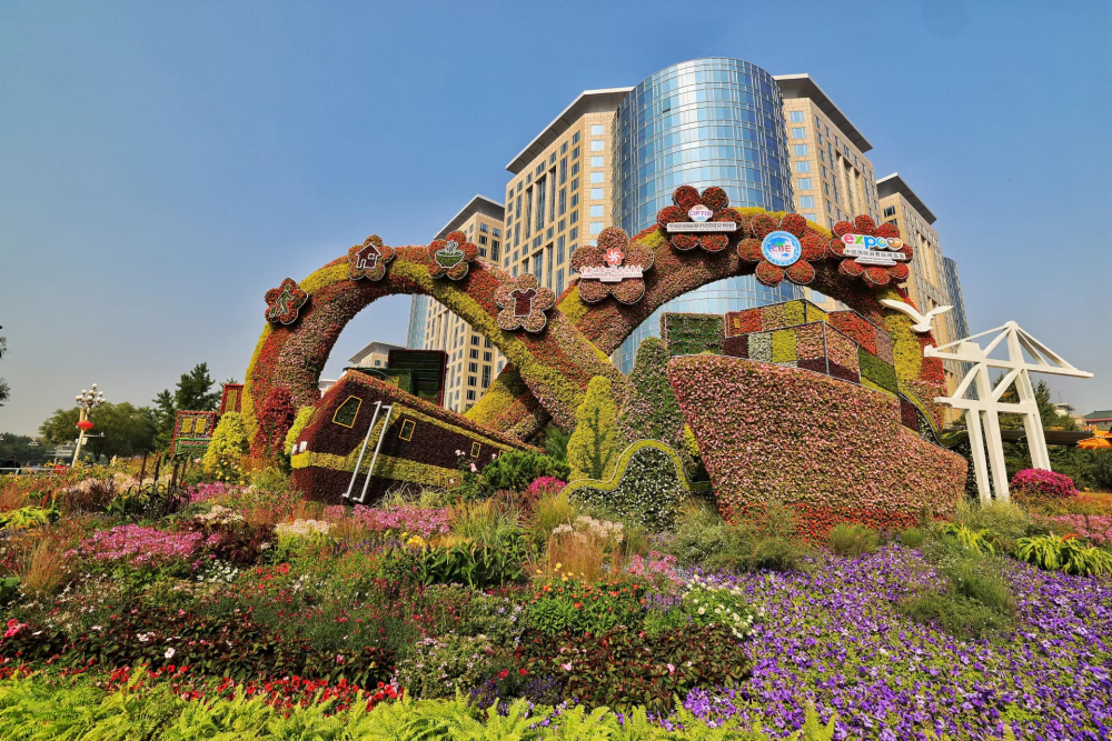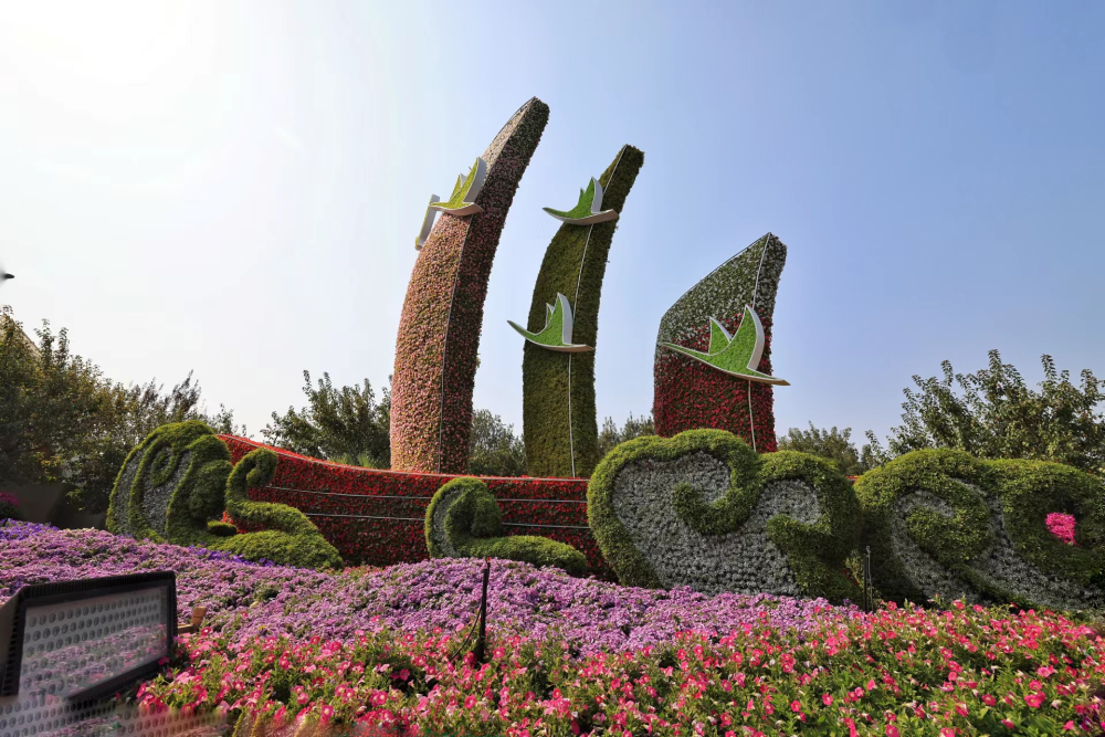 東單西北角佈置“開放發展”花壇,花壇頂高8.5米,以貨輪、中歐班列、紐帶及四大經貿會標誌(廣州廣交會、北京服貿會、上海進博會、海南消博會)為主景,寓意構建國內國際雙迴圈相互促進的新發展格局,推進高水準對外開放。(攝影:王越)