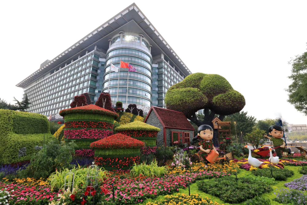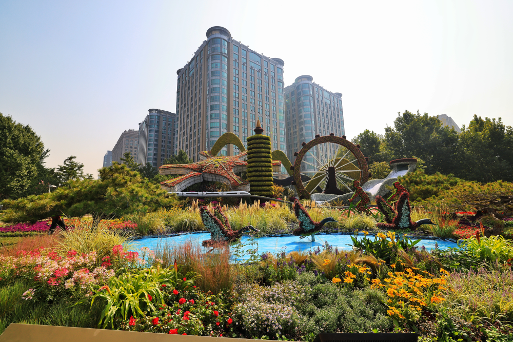 東單東南角佈置“協調發展”花壇,花壇頂高10.5米,以京津冀三地代表建築(大興國際機場、燃燈塔、天津之眼、雪如意)為主景,軌道列車環繞其間,寓意京津冀協同發展,疏解非首都功能,推動雄安新區和城市副中心“兩翼”聯動發展,構建現代化首都都市圈,共同描繪美好未來新篇章。(攝影:王越)