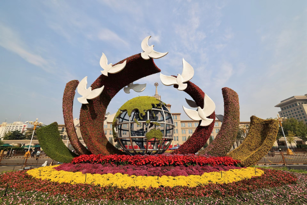 軍事博物館前廣場佈置“命運共同體”花壇,花壇頂高9米,以地球、和平鴿、飄帶為主景,寓意深化全球發展合作,共創共用和平繁榮美好未來。(攝影:王越)
