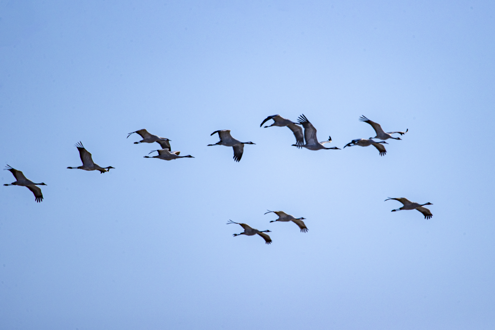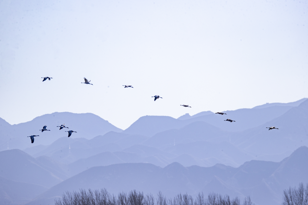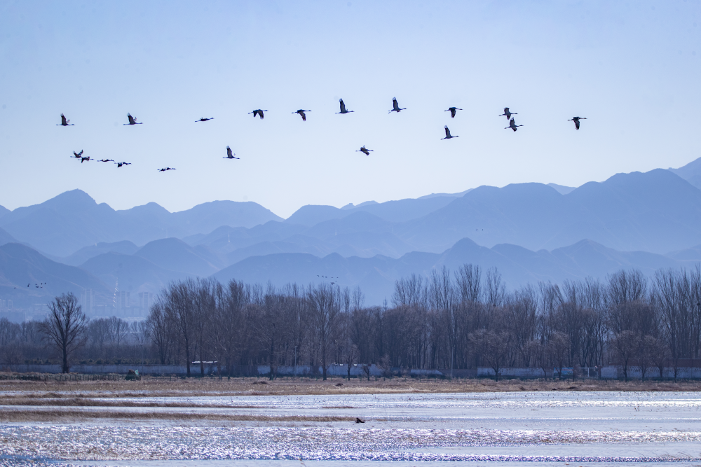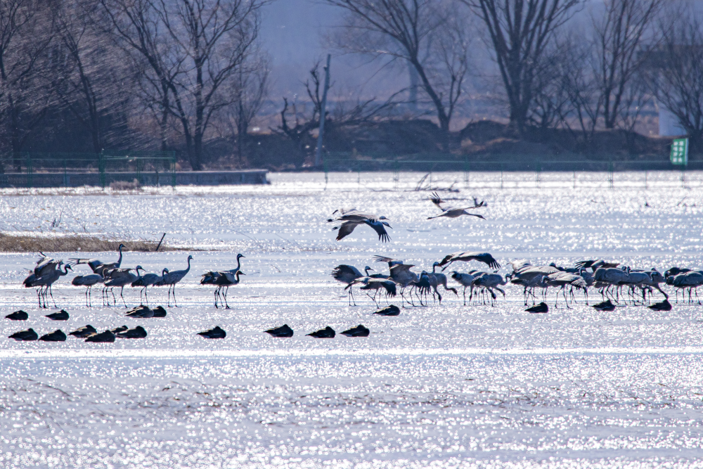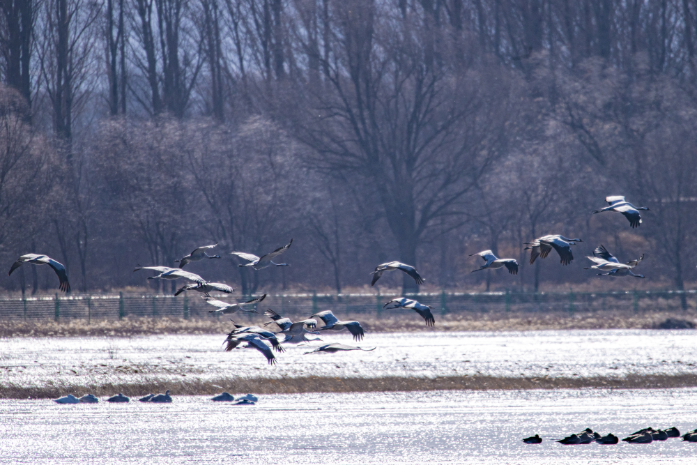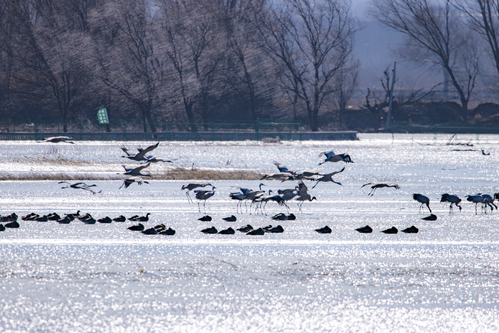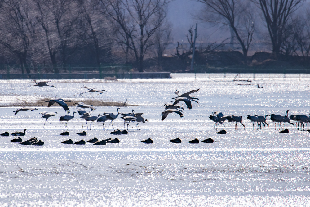 日前,野鴨湖畔迎來近千隻遷徙途中的豆雁,它們身披灰褐色羽毛,宛如湖面上躍動的音符,或低首覓食,或振翅嬉戲,在尚未完全冰封的水面上繪出一幅生動的冬日生態畫卷。(李曉鵬/攝)
