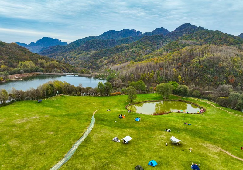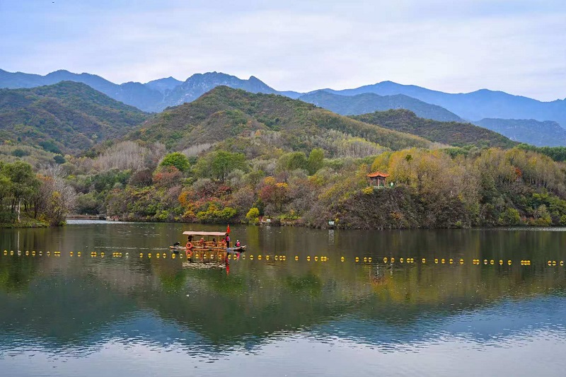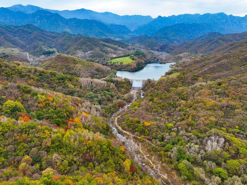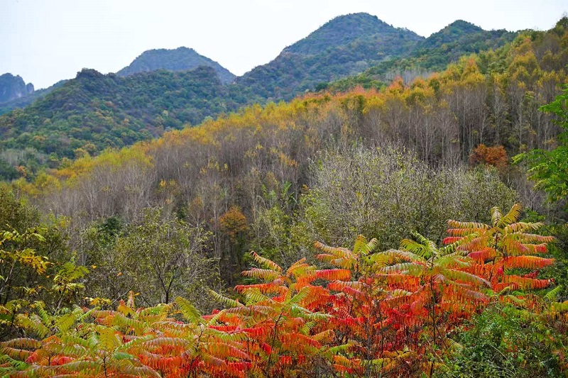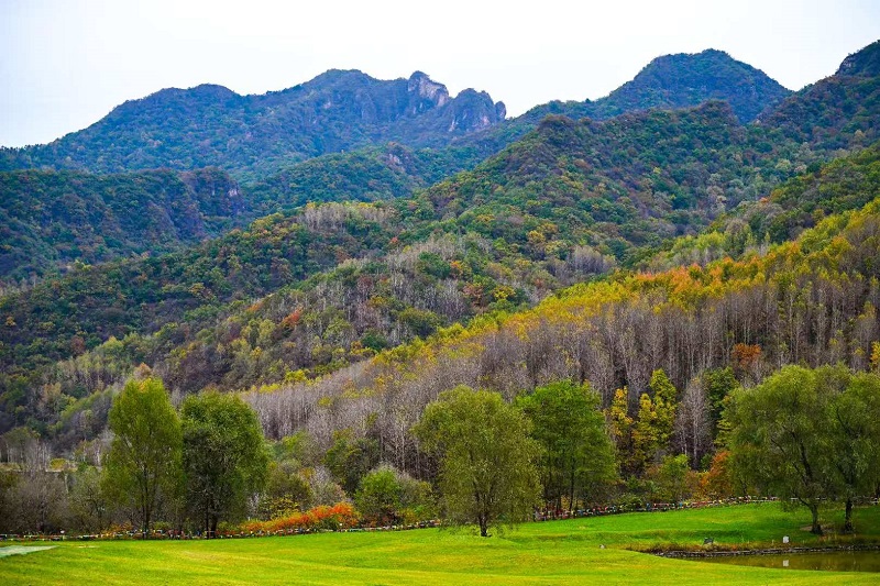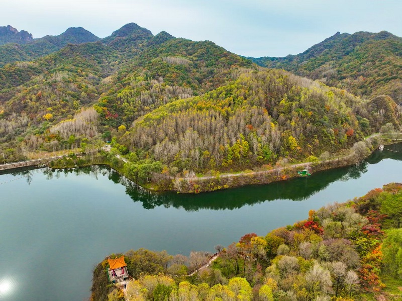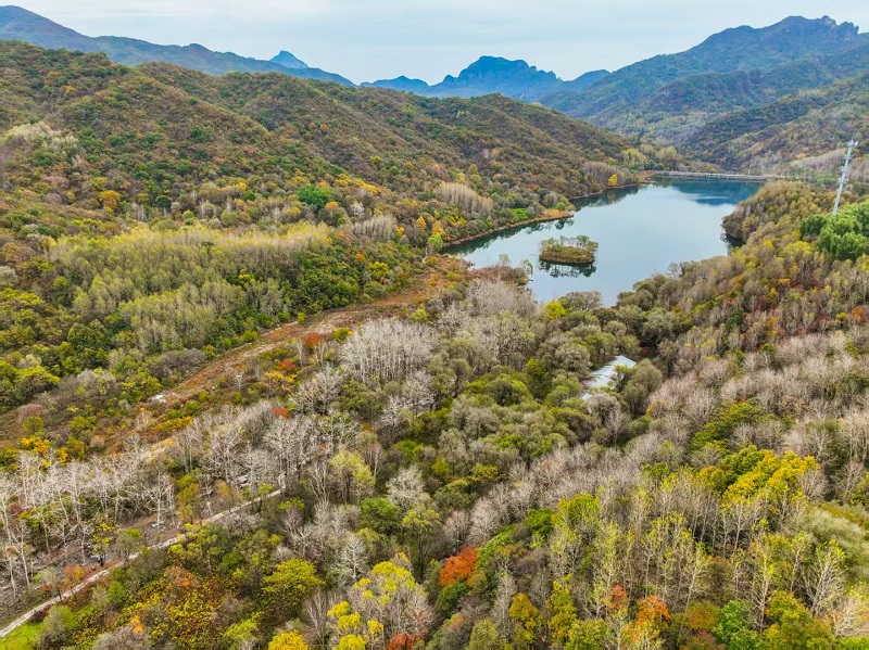 進入十月,玉渡山風景區已是層林盡染,山林色彩漸變交織,白樺樹的葉片變成了金黃色,落葉鋪滿了山間小路。在海拔1500米的森林裏,成片的紅葉為這幅秋日畫卷添上了迷人的色彩。山頂的草甸,視野開闊,遠處的群山連綿起伏,山上的樹木五彩斑斕。穿過山林,潺潺流水匯成碧綠的水潭,格外清澈,形成一幅“碧水映秋” 的絕美畫面。