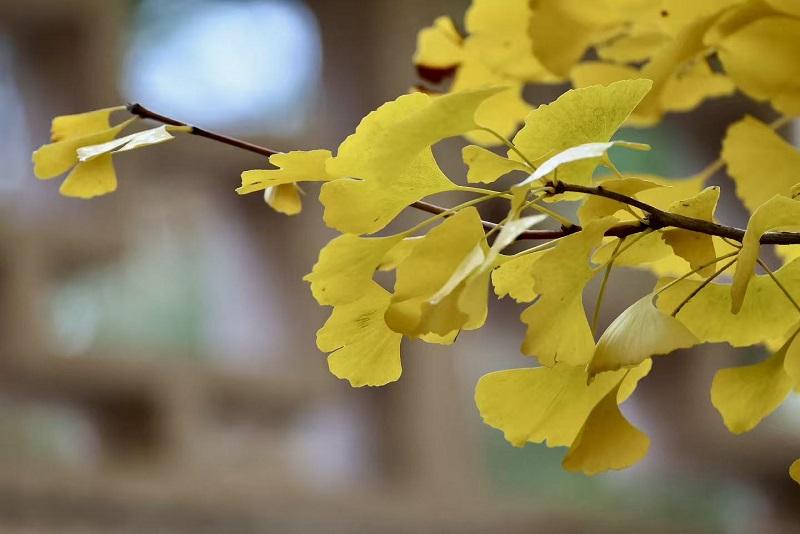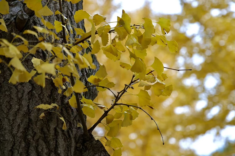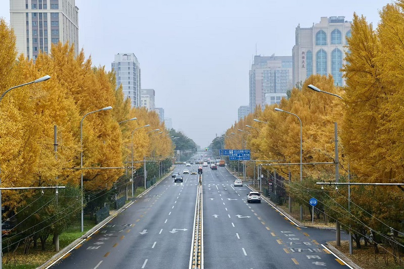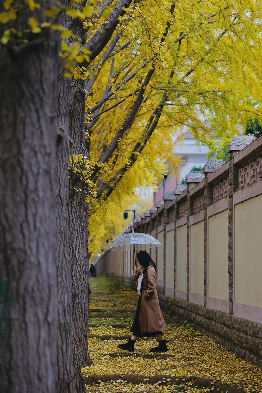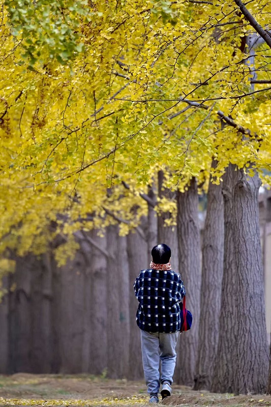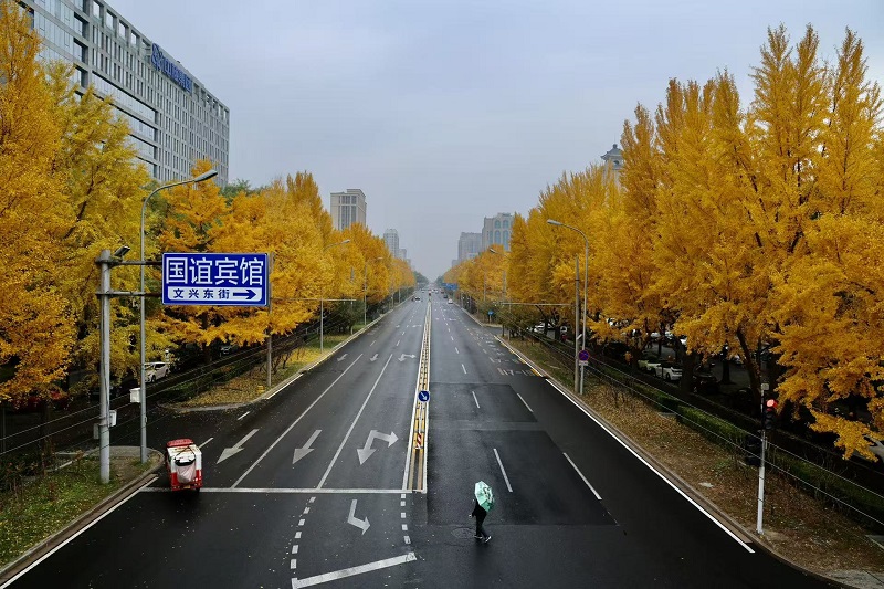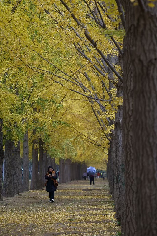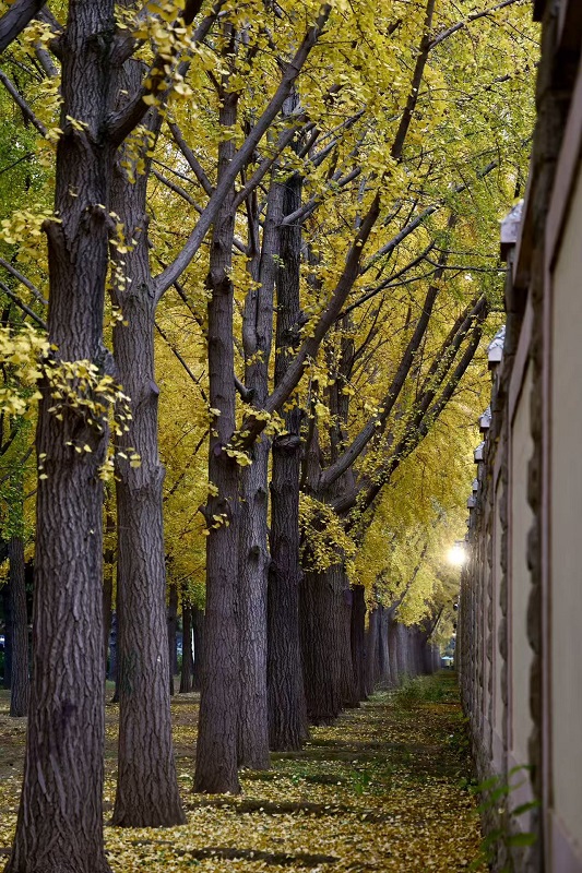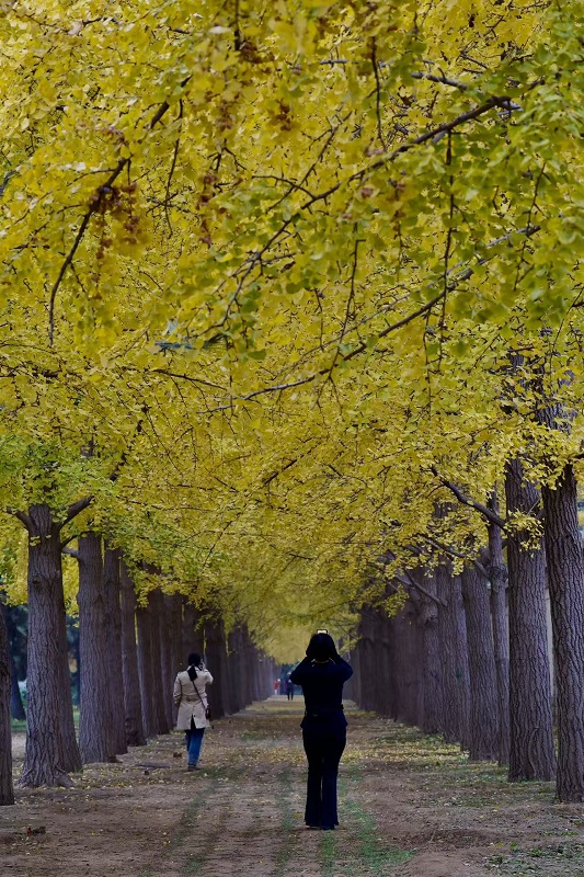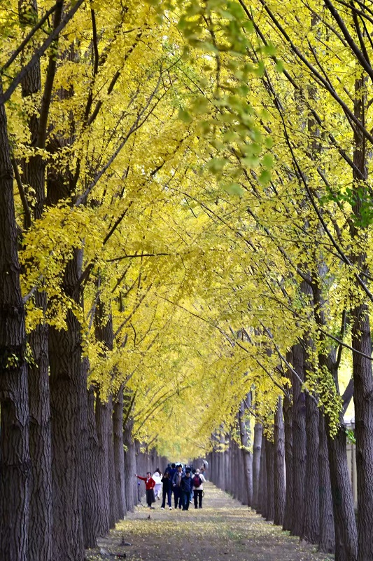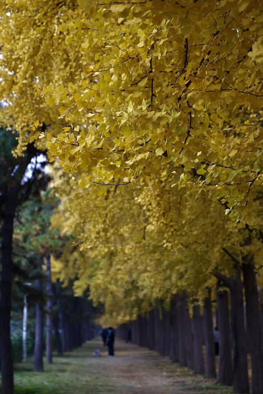 釣魚臺銀杏大道被譽為北京銀杏界的“天花板”,銀杏耀眼而熱烈,它們自由伸展同建築、人群一同構成了一幅斑斕的彩色畫卷。近百米長的銀杏枝葉交織成金色穹頂,落葉鋪就的“金色地毯”。漫步其上,仿佛走入一條金葉編織的隧道,穿越進童話世界。