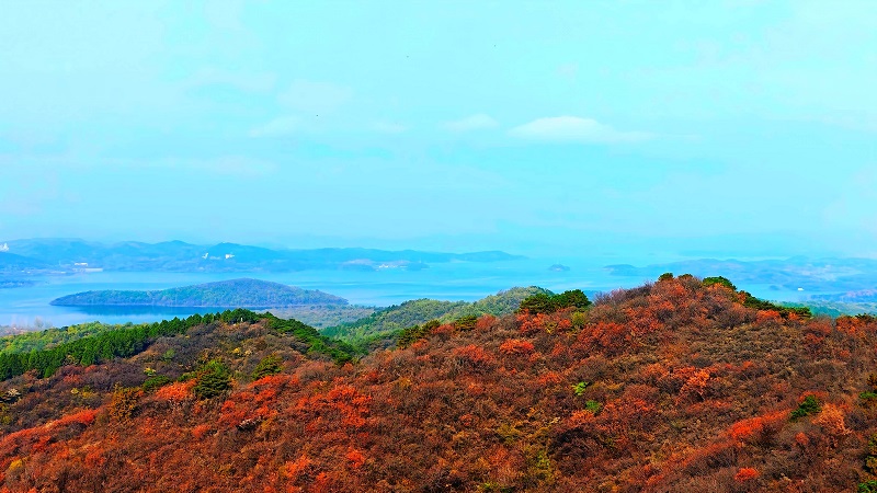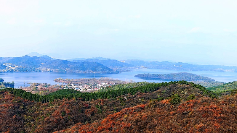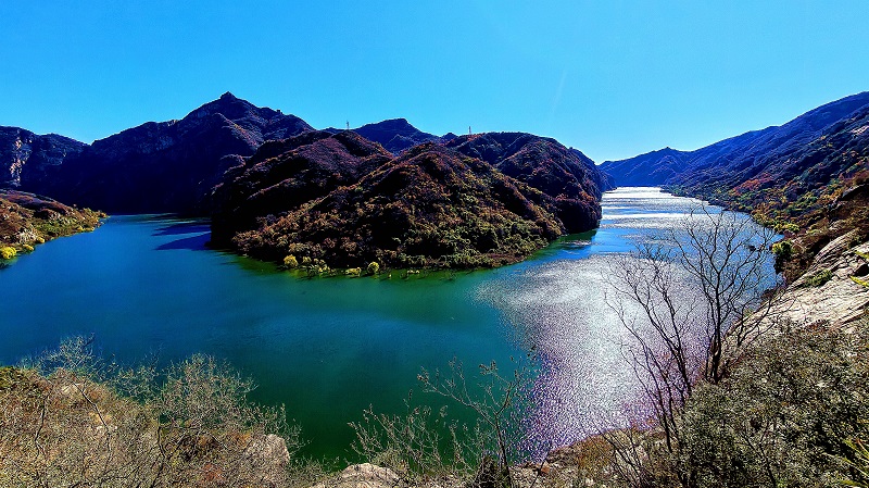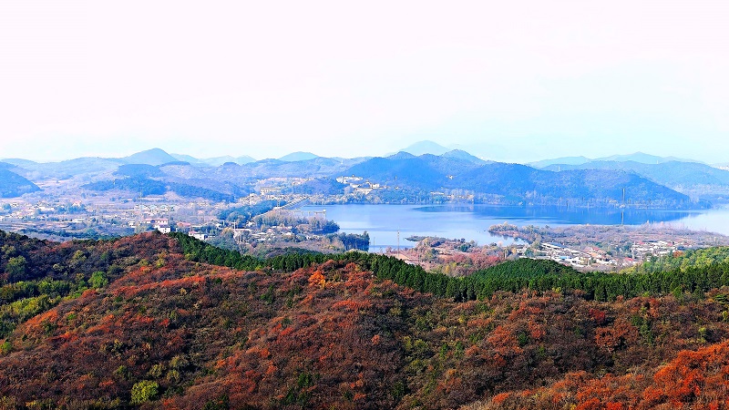 密雲山水的美不止於春花爛漫,秋染紅黃更具成熟厚重的韻味,每年10月下旬至11月上旬,正是登高遠眺的最佳時節。從大石山森林公園入口,約半小時登山路程,抵達日月星空觀景臺,登高遠眺,水纏繞着山,山擁抱着水,山披紅黃綠,水漾藍漣漪,山水間坐落着紅磚青瓦新農村。(攝影:李愛宏)