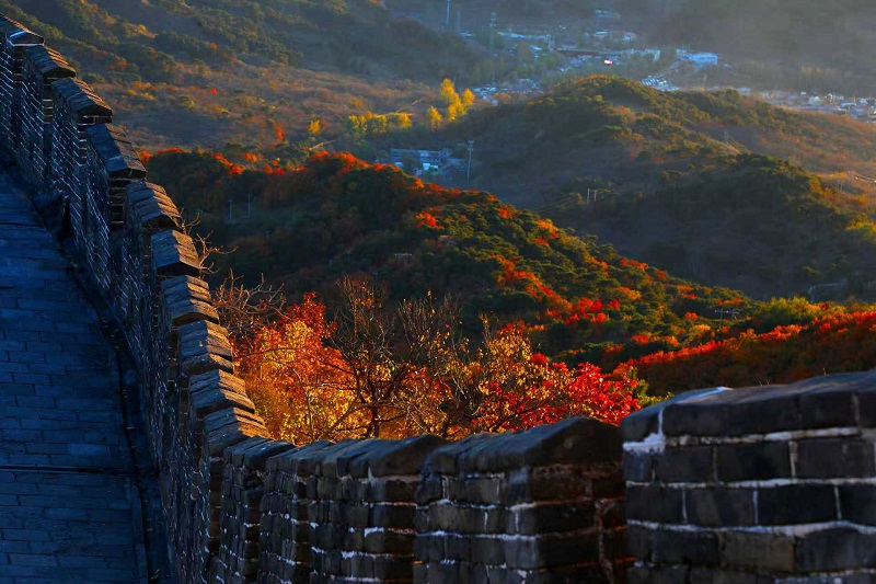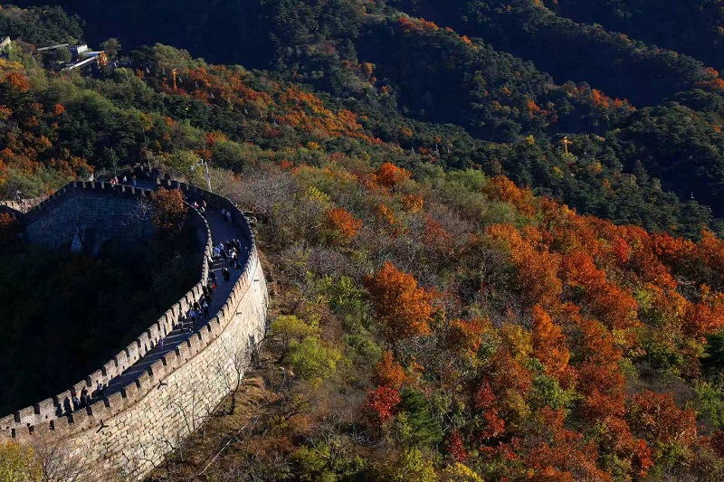 隨着深秋時節到來,北京懷柔區的慕田峪長城迎來一年中最富詩意的游覽季節。在湛藍天空與繽紛林海的映襯下,古老城墻蜿蜒於崇山峻嶺之間,與漫山遍野的紅葉、黃葉交織成絢爛的秋日畫卷,吸引眾多中外游客登高賞景。