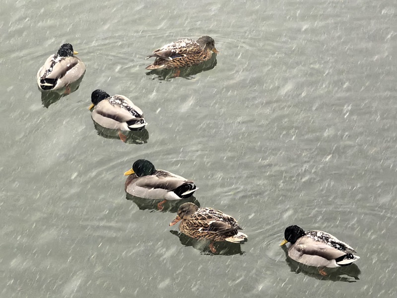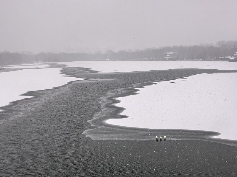 灰蒙的天色下,玉淵潭公園內湖面部分結着冰,三隻潔白的野鴨佇立其中,盡顯冬日公園獨有的淡雅與安謐。(攝影:姚猛)