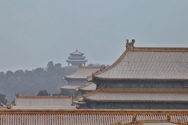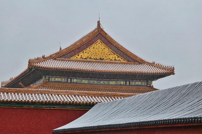 雪中的故宮,處處都像取景框。雪輕柔地落在琉璃瓦上,為那金黃添上一抹純凈的白,宛如給古老的宮殿戴上了柔軟的氈帽。宮墻巍峨,在雪幕中更顯莊重。