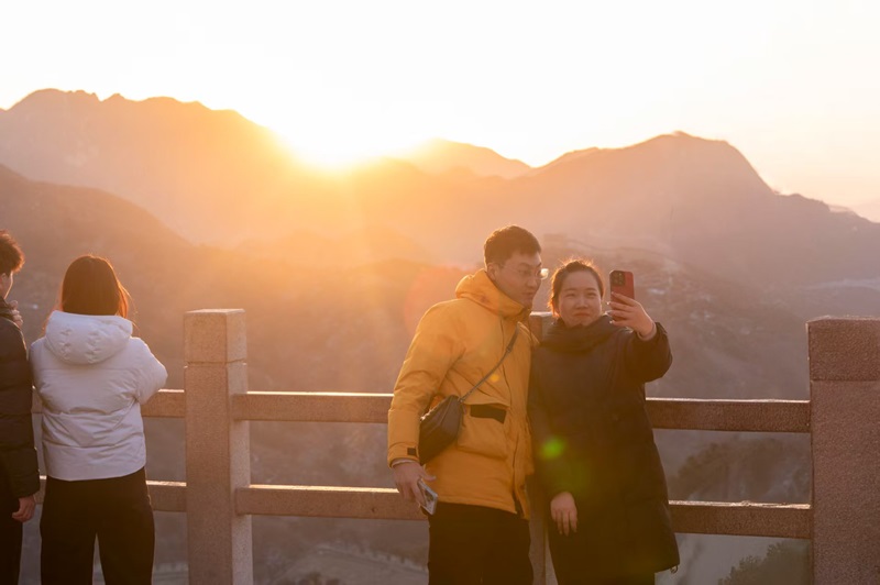 2026年1月1日,旭日東昇,雄偉的八達嶺長城迎來新年第一縷燦爛陽光,金色的光輝傾灑在古老城垣,勾勒出一幅雄渾壯美的畫卷。長城宛如一條閃耀的巨龍,承載着歷史的厚重與新歲的希望。游人們置身於長城之上,沐浴溫暖晨光,臉上綻放出燦爛笑容,帶着新年的喜悅與豪情許下2026年最美好的心願。2026,祝願祖國繁榮昌盛,人民喜樂安康。(李曉鵬/攝)