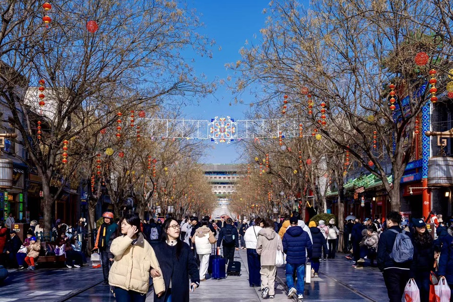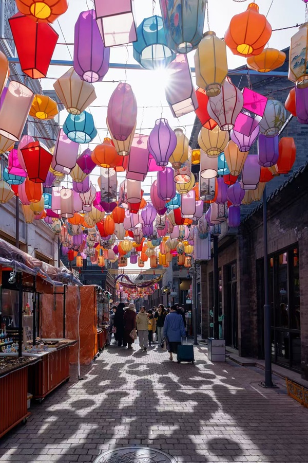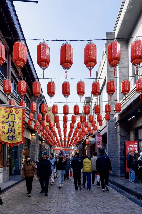 前門大街在春節前煥然一新,滿街張燈結綵,中國結和綵燈將街道裝點成喜慶的海洋,營造出濃厚的年味兒。
