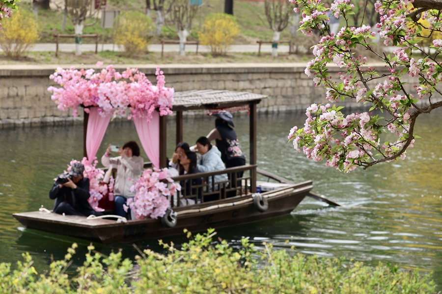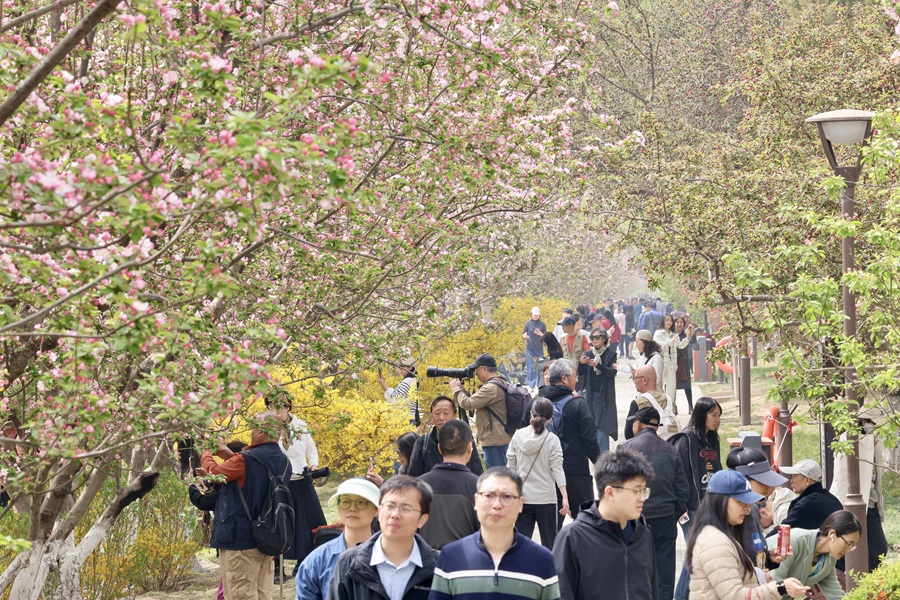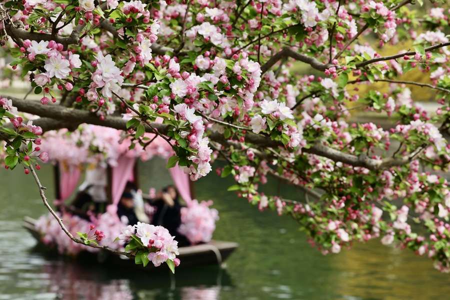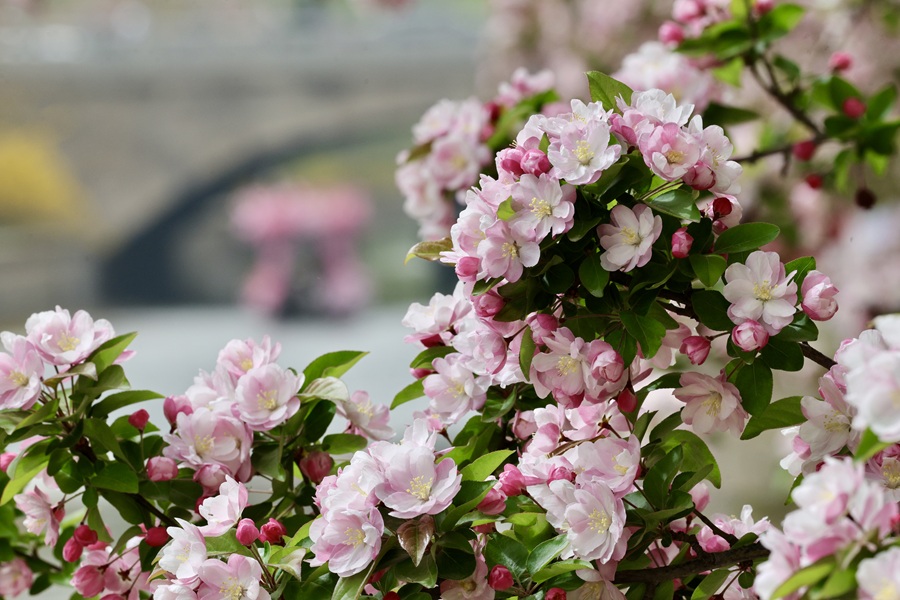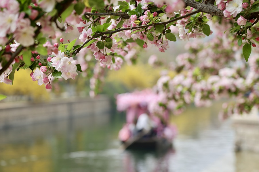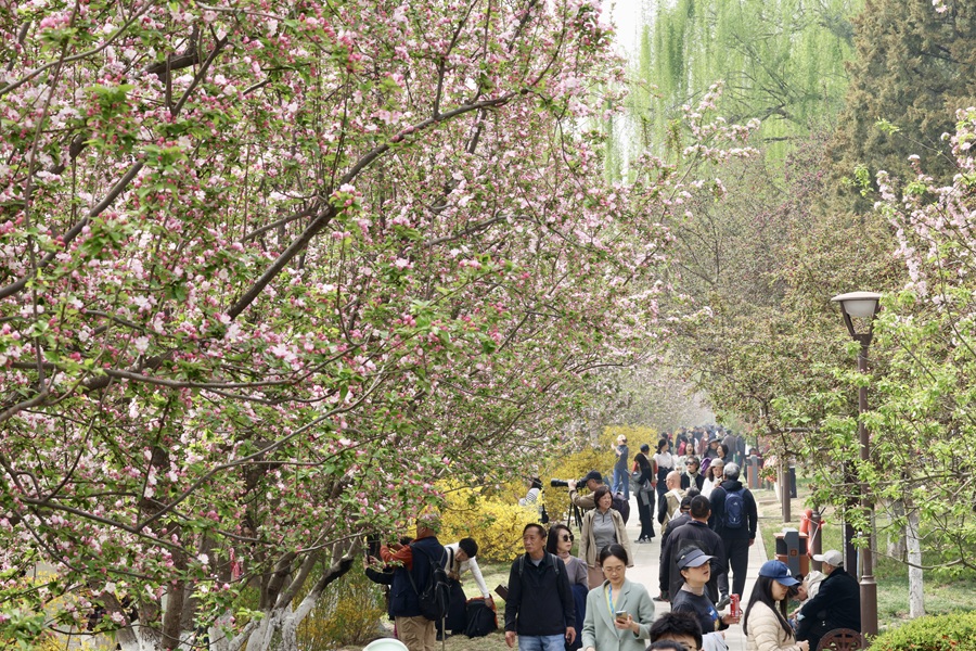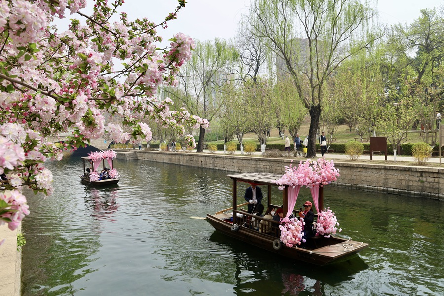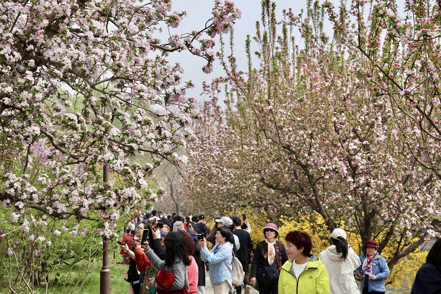 四月,元大都城垣公園的海棠花盛放,正式進入觀賞期。微風拂過,粉的白的花瓣隨風落入水面,隨河水靜靜流淌,形成名動京城的“海棠花溪”景觀。