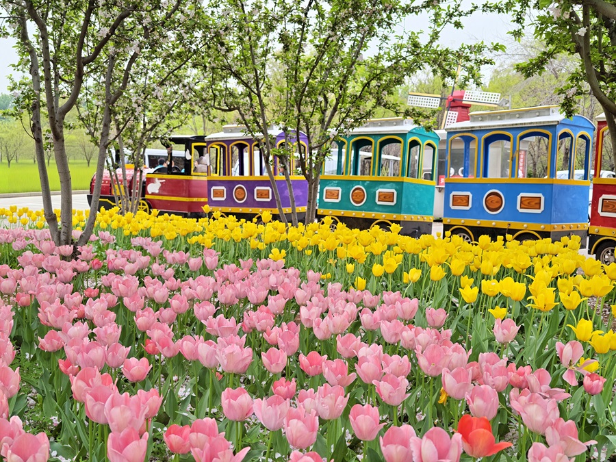 春日花海漫遊。小火車穿行其間,把春天的童話感拉滿。(攝影:崔慧蘭)