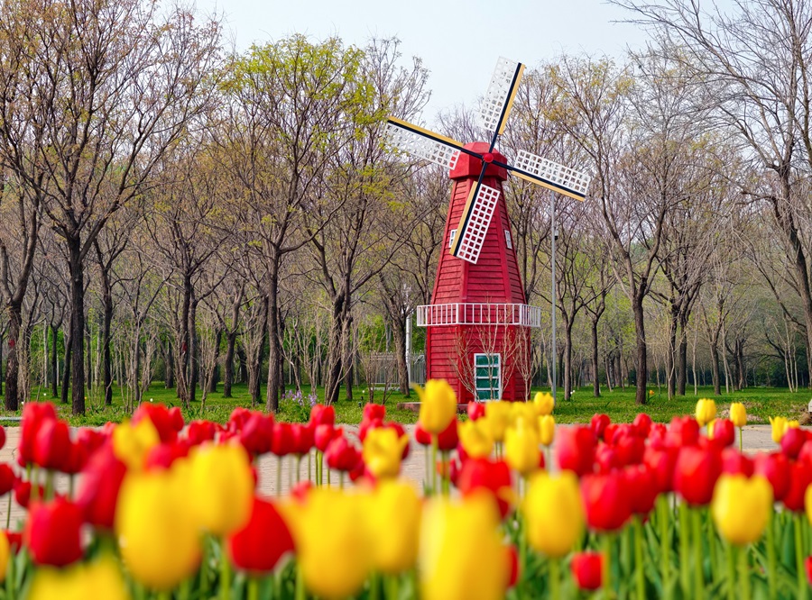 風車鬱語。風車與盛放的鬱金香相襯相映,充滿詩意。(攝影:崔慧蘭)