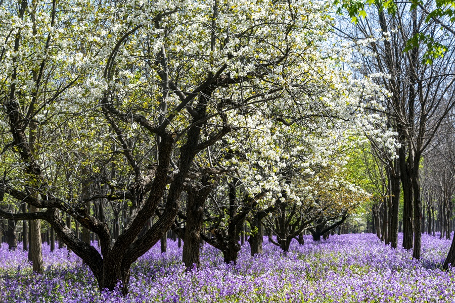 一樹梨花 伴紫蘭嫣。 (攝影:劉瑞春)