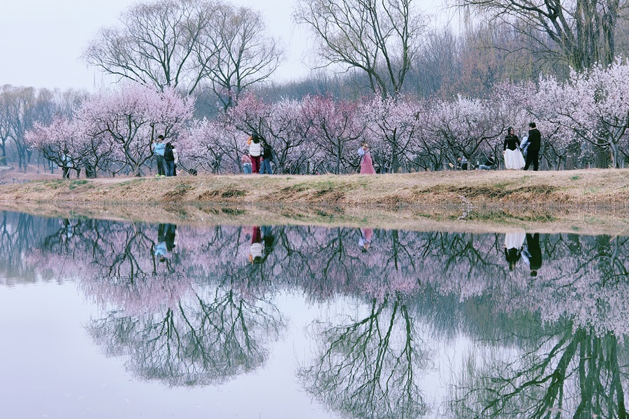 念壇春色。遊人漫步在花間湖畔,春色與水中倒影兩兩相映。(攝影:崔慧蘭)