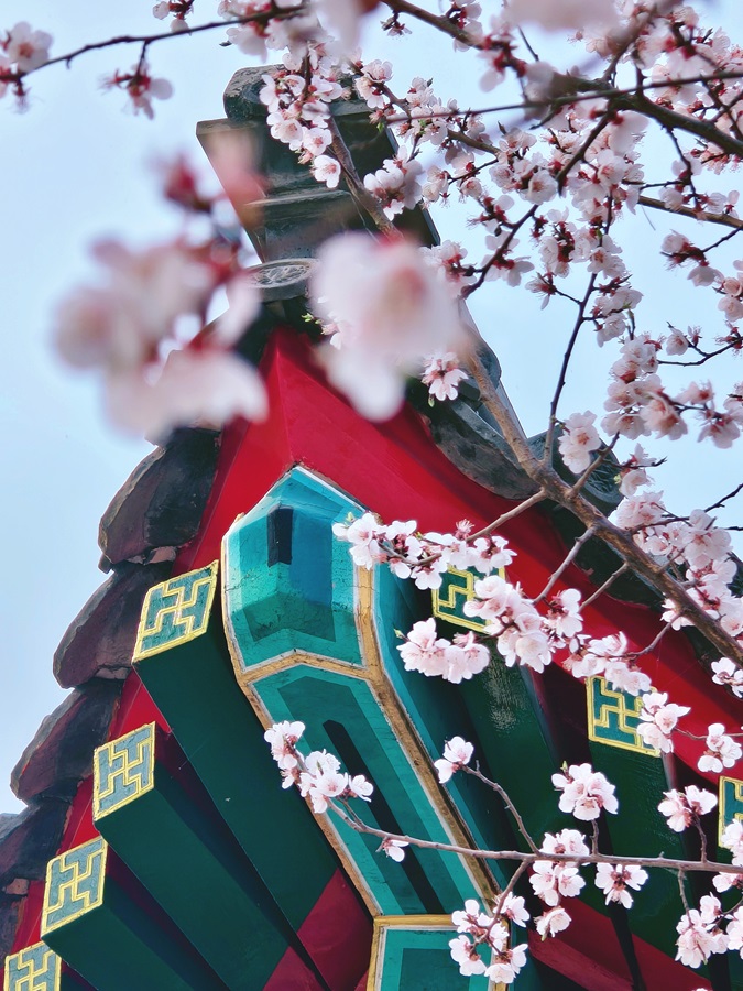 團河行宮,古檐花信。飛檐邂逅盛放春花。(攝影:崔慧蘭)
