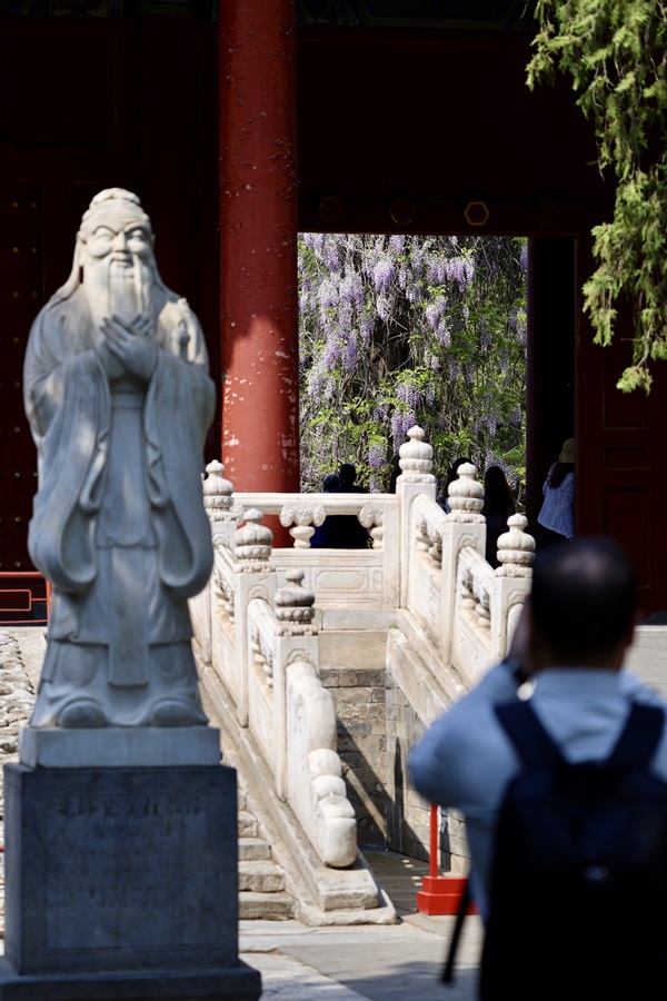 紫藤季已到!近日,北京孔廟和國子監博物館院內的十余株紫藤已陸續開放。琳瑯光影,紫藤繞梁,在這京城春日,不妨共賞古意與芬芳交織的紫藤花事。(攝影:李磊)