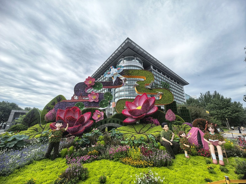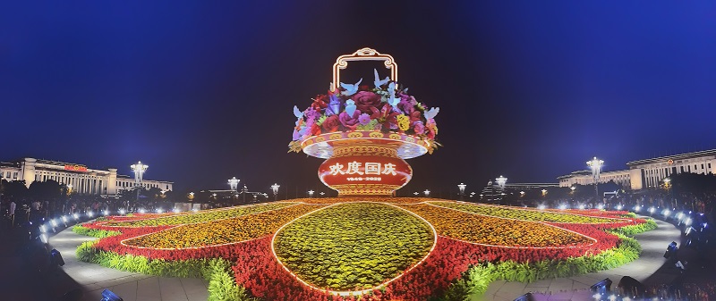 以“奮進新征程、建功新時代”為主題,2025年國慶,天安門廣場佈置“祝福祖國”巨型花籃,長安街沿線設置10組立體花壇,展現“國家富強、民族振興、人民幸福”的內涵。(攝影:王越)
