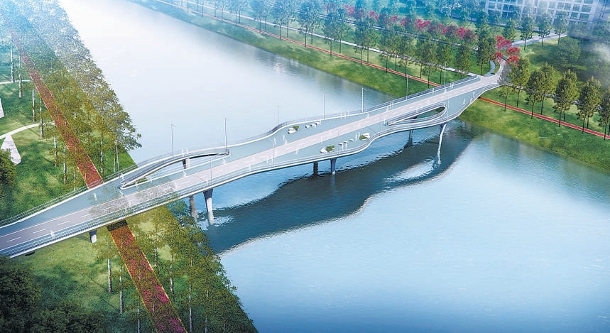 運潮減河上,一座半幅完工的景觀橋靜臥水面。這座橋是示範段工程的核心節點。作為連接宋莊藝術創意小鎮、含章園與行政辦公區的“快速長廊”,這項全長約3公里的慢行工程(含206米橋梁段)將騎行、漫步、觀景與城市文化深度融合,為市民織就一張高效、詩意的出行網路。