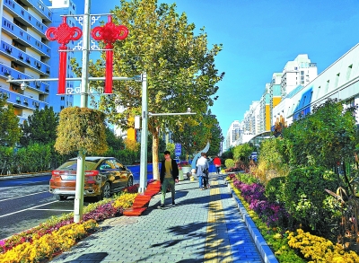 鎮國寺北街:立體花卉、一組組花缽,景觀帶鮮花綠植一路相伴,儼然一條悠然的慢生活綠色廊道。(史薇攝)