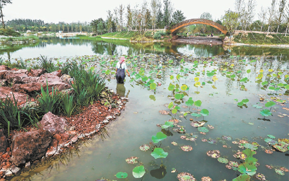 在野趣盎然的溫榆河公園,環衛工作者正在清理水面上的浮葉。(戴冰攝)