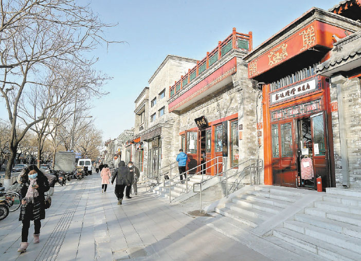 1月18日,東四北大街路邊的建築物和店面都按照修舊如舊原則還原了古都特色。目前,東四南、北大街環境整治提升主體工程已基本完成。(冠欣攝)