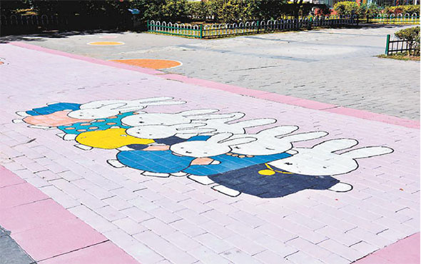 小廣場的地面和井蓋上手繪有卡通圖案,成為孩子們的樂園。