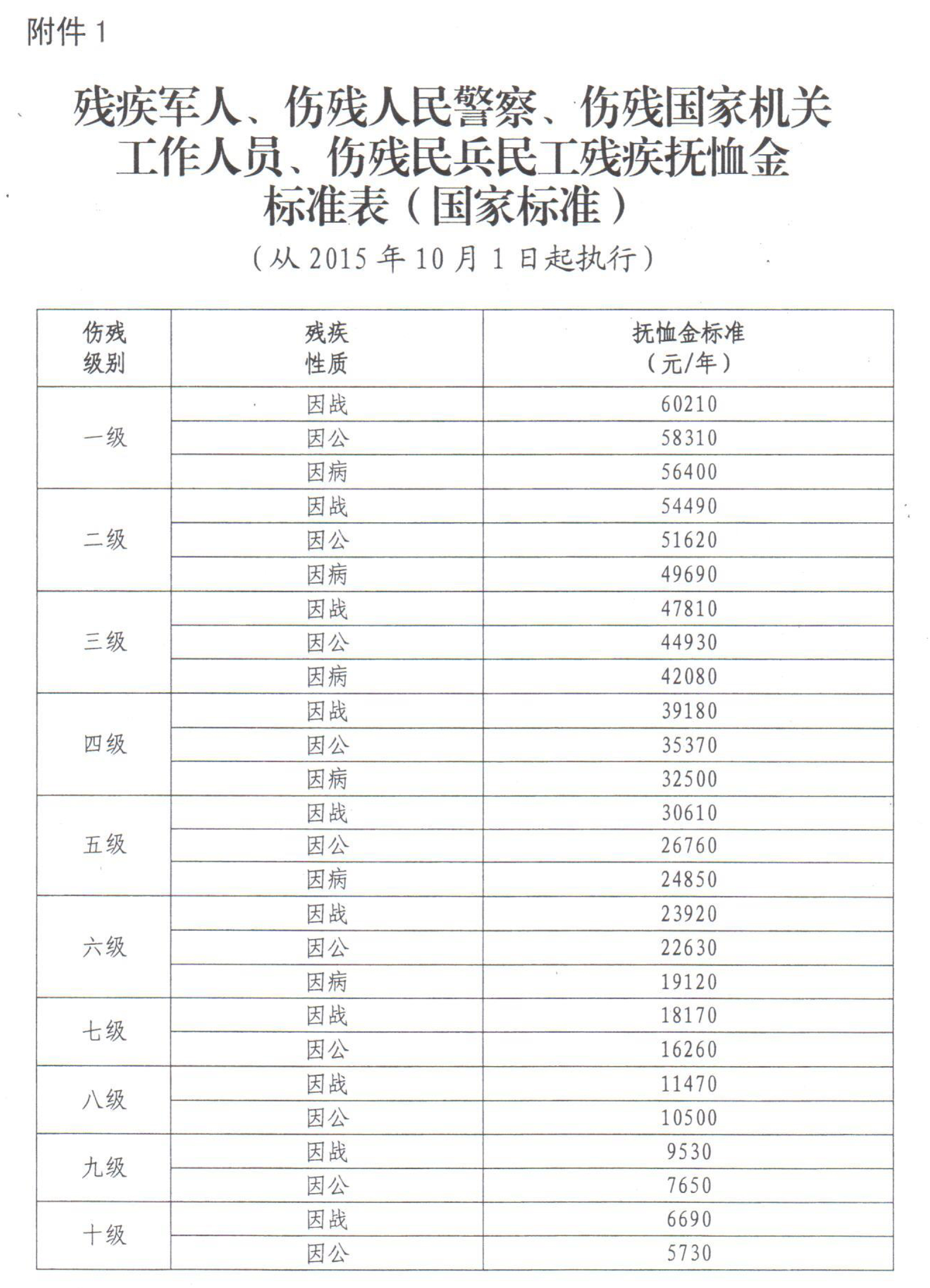 - 附件1:殘疾軍人、傷殘人民警察、傷殘國家機關工作人員、傷殘民兵民工殘疾撫恤金標準表(國家標準)