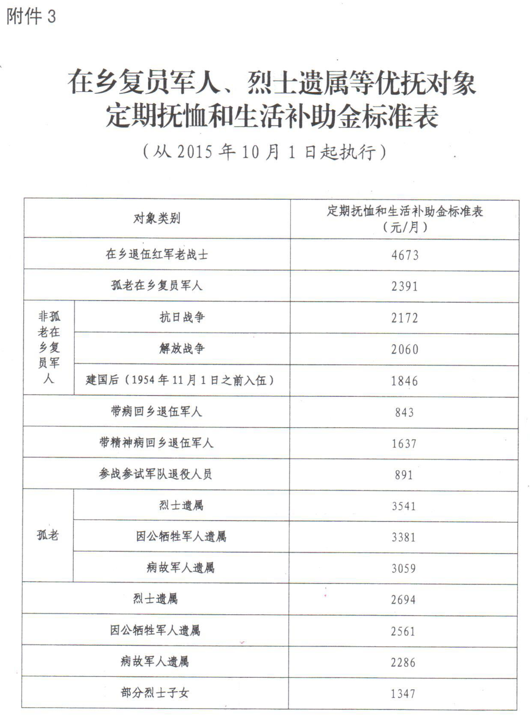 - 附件3:在鄉復員軍人、烈士遺屬等優撫對象定期撫恤和生活補助金標準表