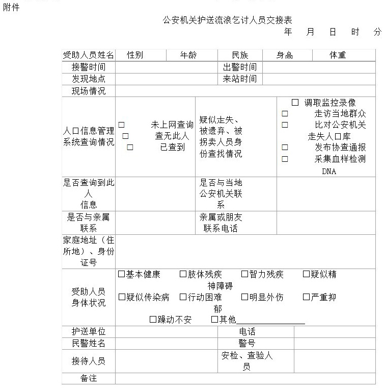 3.公安機關護送流浪乞討人員來站求助的,應當配合救助管理機構辦理交接手續,並填寫《公安機關護送流浪乞討人員交接表》(見附件)中相關內容。
