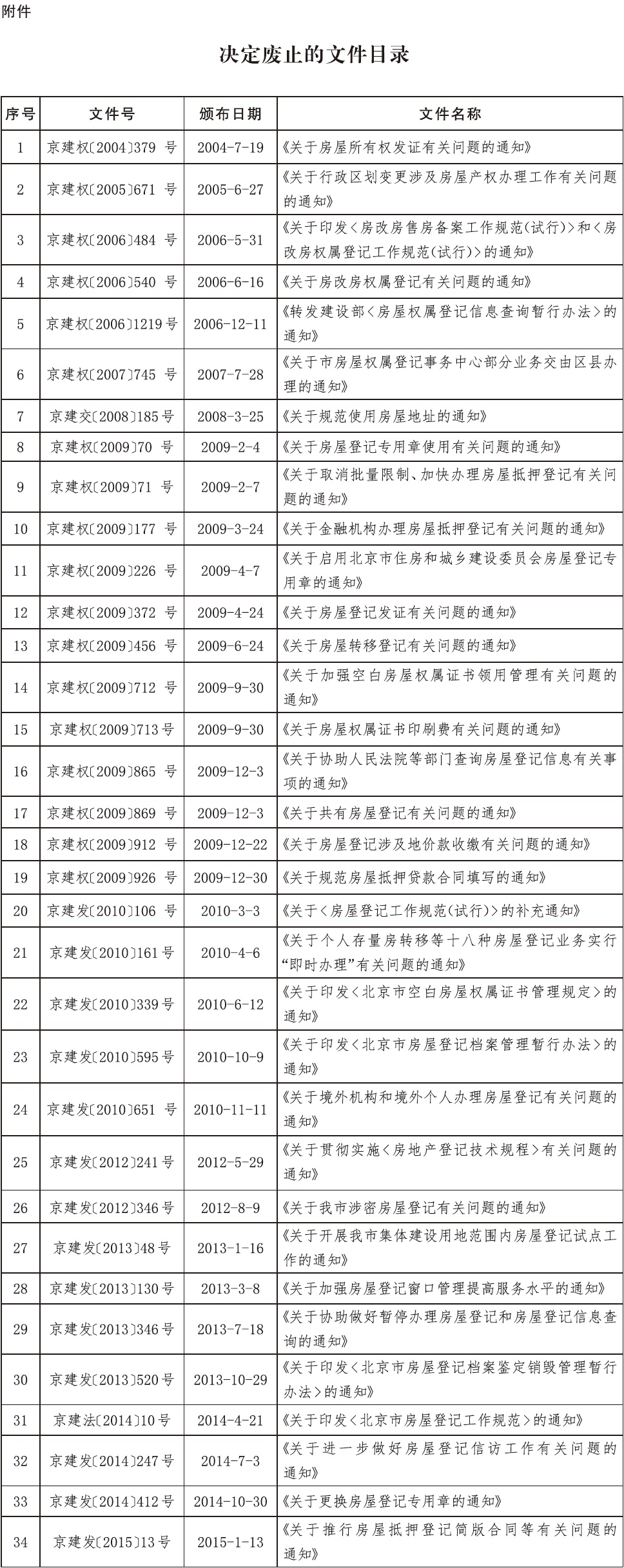 根據《不動産登記暫行條例》(國務院令第656號),市規劃國土委發佈了《關於印發<北京市不動産登記工作規範(試行)>的通知》(市規劃國土發〔2016〕100號)。為了進一步規範不動産登記工作,做好前後政策的銜接,市住房城鄉建設委與市規劃國土委共同決定廢止《關於房屋所有權發證有關問題的通知》等34件涉及房屋登記的相關文件。