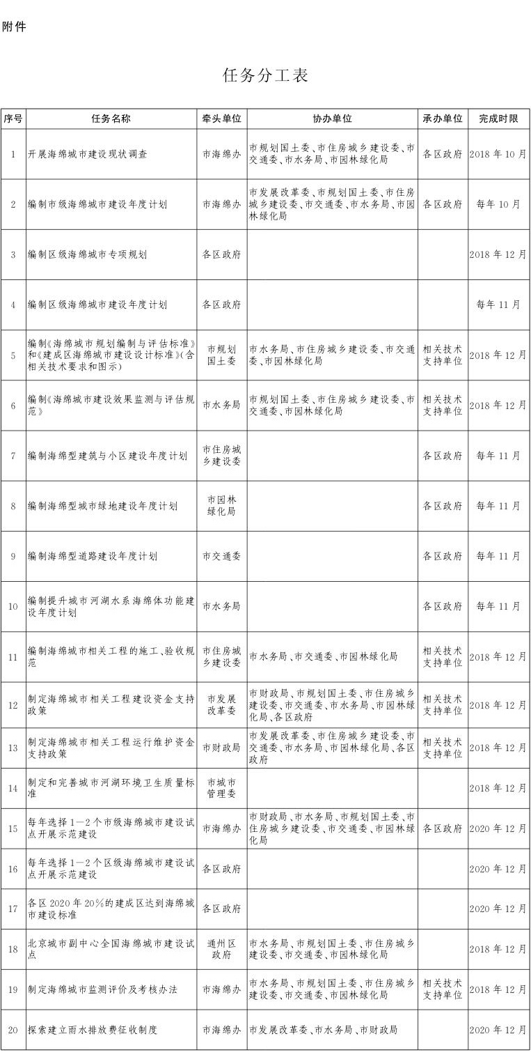 (一)加強組織領導。建立由相關部門組成的北京市海綿城市建設工作聯席會議制度,統籌推進本市海綿城市建設,研究解決工作中的重點難點問題;聯席會議辦公室(以下簡稱市海綿辦)設在市水務局,負責聯席會議日常工作和會議議定事項落實,辦公室主任由市水務局局長擔任。各區政府是本區海綿城市建設的責任主體,要把海綿城市建設擺上重要日程,完善工作機制,明確職責分工,加快落實各項規劃建設任務。市、區發展改革、財政等部門要研究制定海綿城市相關工程建設、運作維護資金的支援政策,加大資金投入力度,做好資金保障工作。