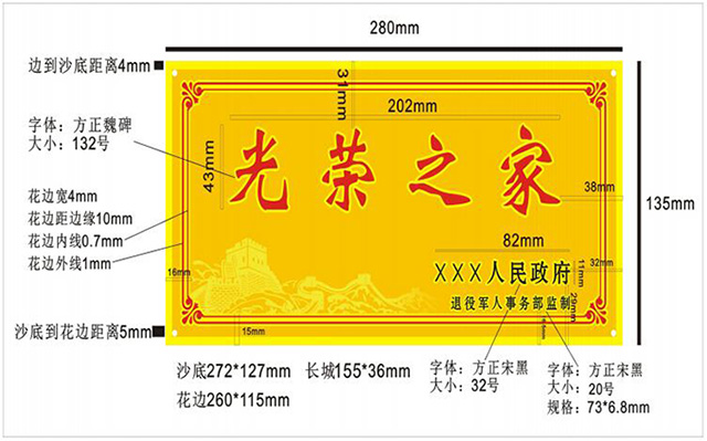 光榮牌(式樣圖附後)材質為鈦金牌,底色為金黃色、沙底鍍金;規格為280毫米×135毫米,厚度1毫米;“光榮之家”字樣為紅色套亮金邊,方正魏碑簡體132號字,四個字規格為202毫米×43毫米,距上邊31毫米,左右居中;“×××人民政府”字樣為方正宋体黑色32號簡體字,規格為82毫米×11毫米,距下邊29毫米,距右邊32毫米;左下角配長城圖案、亮金色,規格為155毫米×36毫米,距下邊15毫米,距左邊16毫米;紅色花邊寬4毫米,距邊緣10毫米,花邊內線粗0.7毫米,花邊外線粗1毫米。右下花邊內“退役軍人事務部監製”字樣為方正宋体黑色20號字,規格為73毫米×6.8毫米,距下邊16.5毫米,與“×××人民政府”右端對齊。