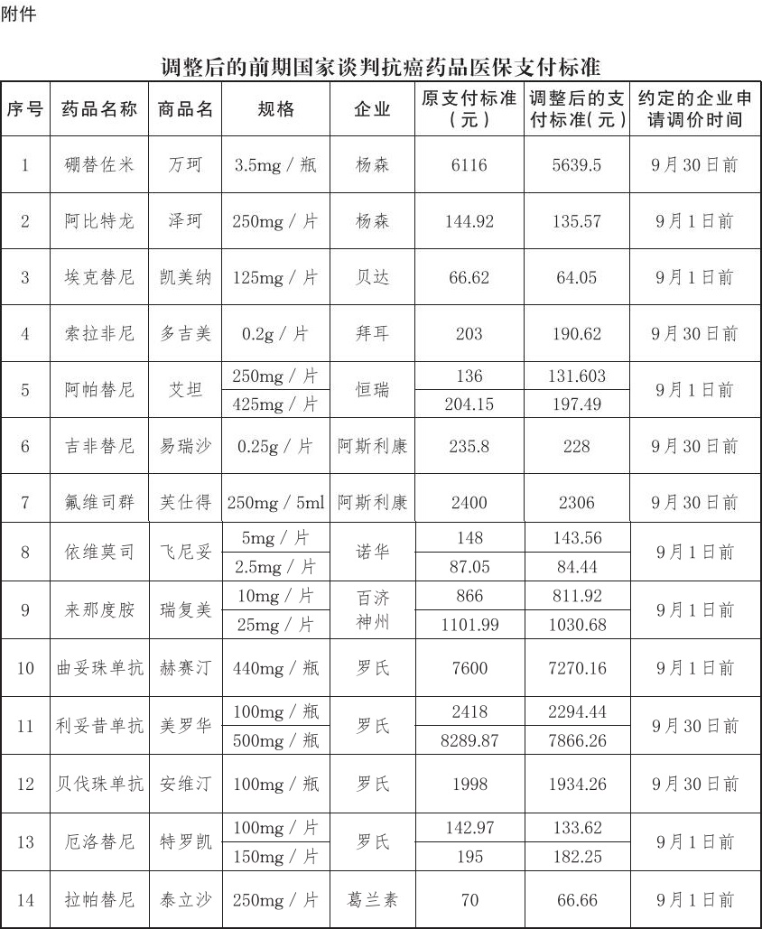 一、此次調整只針對前期國家談判抗癌藥品的醫保支付標準,不涉及其他醫保支付、使用的政策。前期國家談判抗癌藥品調整後的醫保支付標准詳見附件。
