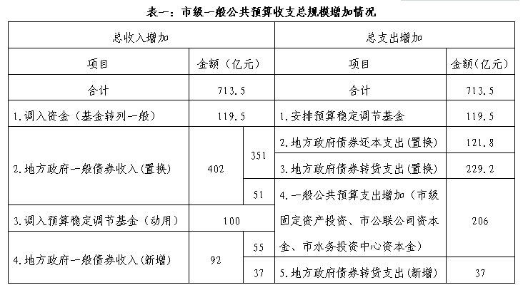综上调整情况,市级一般公共预算收支总规模共增加713.5亿元(见表一),市级政府性基金预算收支总规模共增加114亿元(见表二)。