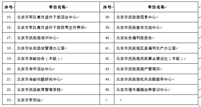 北京市民政局预算单位45个,其中:所属行政单位2个(含行政执法机构1个),所属事业单位43个。具体为: