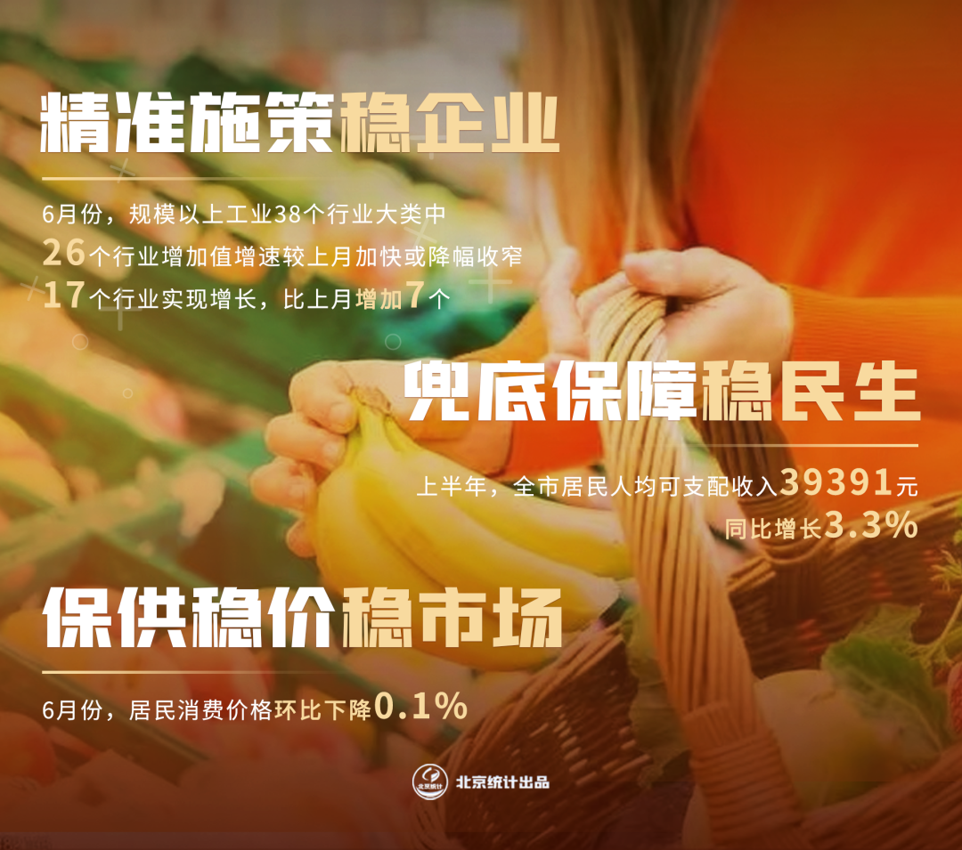 保供稳价稳市场。制定应急供应保障工作预案,延长批发市场进场交易费减免政策,基本生活类商品供应充足,限额以上粮油食品类、饮料类商品零售额保持增长,上半年增速分别达到6.2%和9.8%。加大稳价力度,6月份居民消费价格环比下降0.1%,其中,食品价格环比下降3.3%,鲜菜、鲜果分别下降14.5%和8.8%。