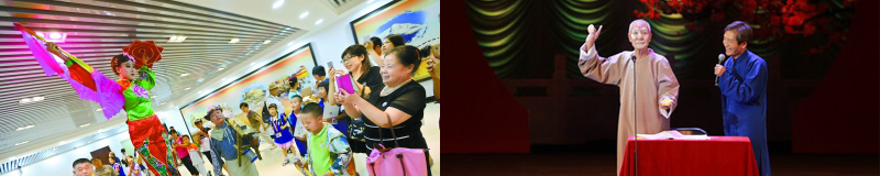 非遗传承项目“赛活驴”、“老北京叫卖”的表演者在演出前与观众互动。