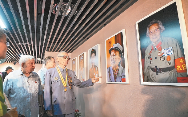 92岁高龄的新四军老战士储渭专门换上了一身戎装,到抗战馆参观。他胸前佩戴的勋章在阳光下熠熠生辉。走进展厅,储渭仔细观看着一幅幅肖像照。面对一张张熟悉又陌生的面孔,他眼中满是深情。他说:“仿佛是一次老战友的聚会,他们之中有的人已经不在了,但他们的形象被永远定格,他们的故事应该被世人铭记。”
