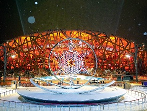 雪夜,北京赛区颁奖广场“雪花”火炬展示台与鸟巢交相辉映。(方非 摄)