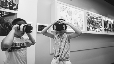 在海淀北部文化中心,市民通过VR眼镜体验街景变化。