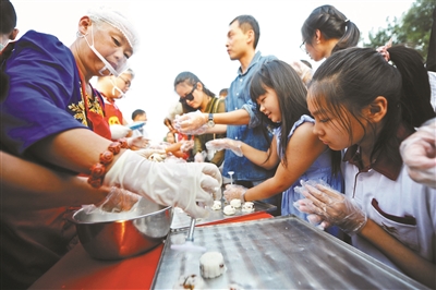 9月12日晚间,随着河北梆子传统戏曲《大登殿》的开唱,恭王府前广场举行了盛大的晚会表演。在广场中的众多摊位上,摆满了具有民族风情的木版年画、传统风筝、脸谱、毛猴、鼻烟壶等。现场多个摊位均推出了互动体验环节,其中最有人气的当属做冰皮月饼和画兔爷,将雪白的冰皮粉兑水揉好,塞入馅料,放进模具中按压成型,半个巴掌大的冰皮月饼就完工了。在月饼摊旁边,非物质文化遗产传承人双彦和徒弟坐在泥彩塑的摊位上,指点凑上来画兔爷的小朋友。老虎、梅花鹿、大象……坐骑各异的兔爷摆放在一旁的架子上,将摊点团团围住的小朋友则一手持泥塑,一手持画笔,描画着或滑稽或可爱的独特兔爷形象。