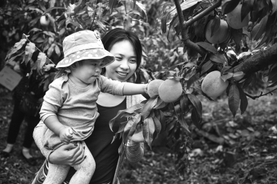 9月13日上午,在平谷区大华山镇挂甲峪村桃园,游客正在采摘晚熟桃。