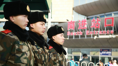 北京西站南广场,武警战士时刻关注着情况,为春运保驾护航。